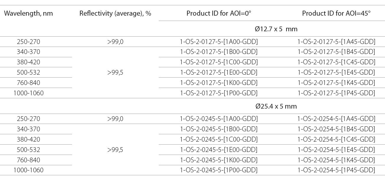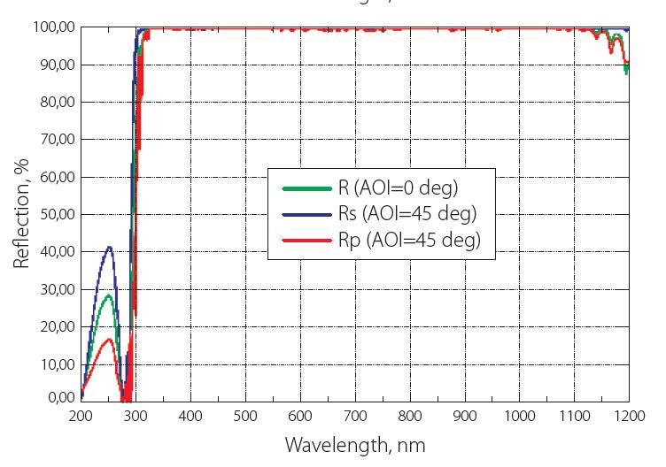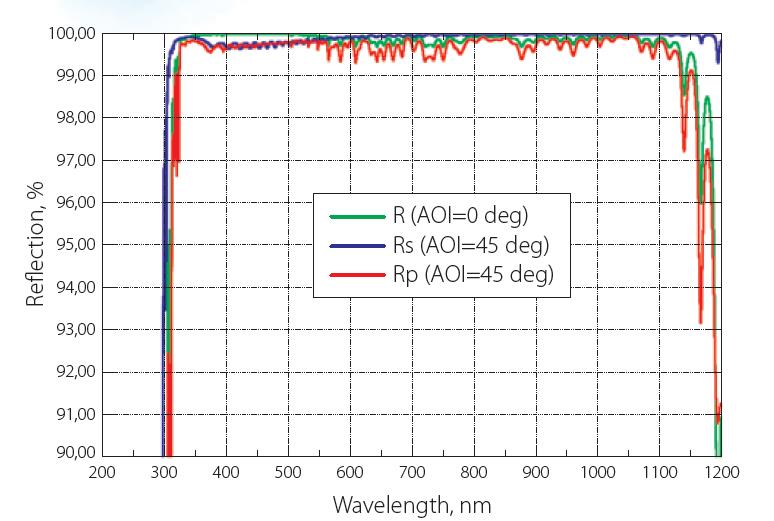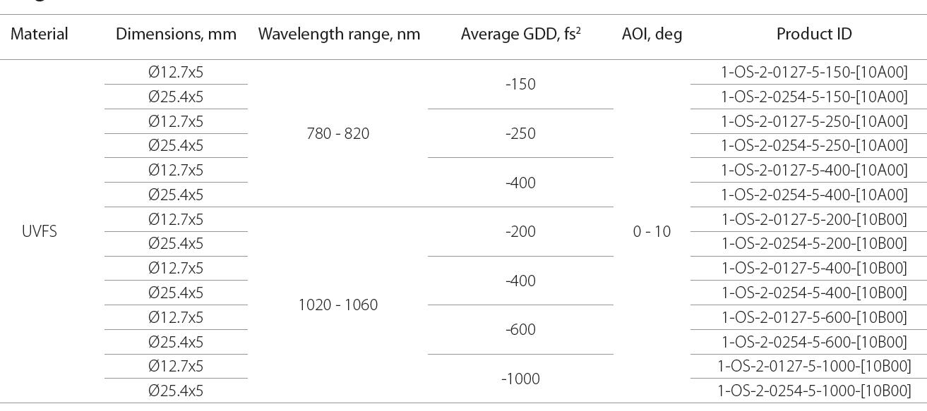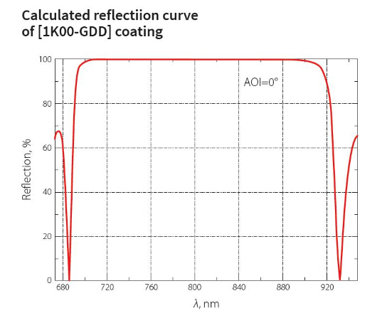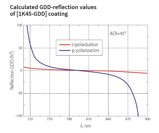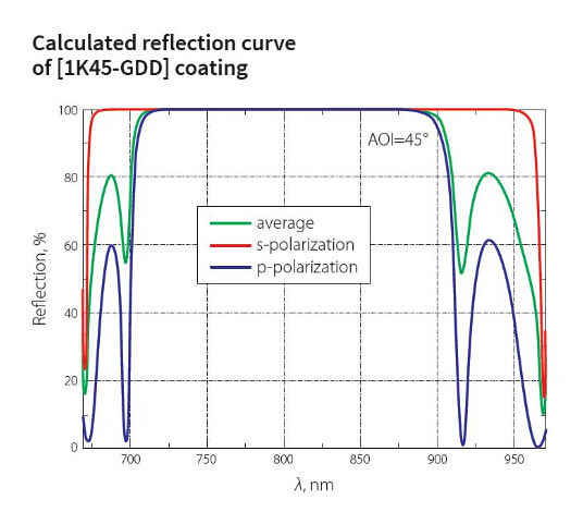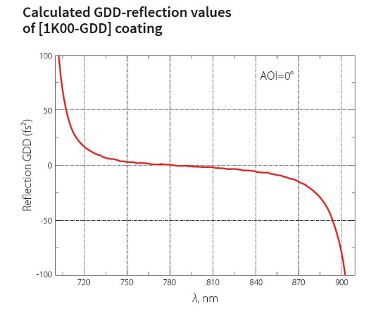 低GDD超快发光镜对于一定的波长和入射角的光束有良好的优化,主要用于飞秒应用,可同时兼顾高反射率和低GDD。