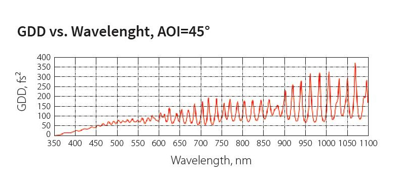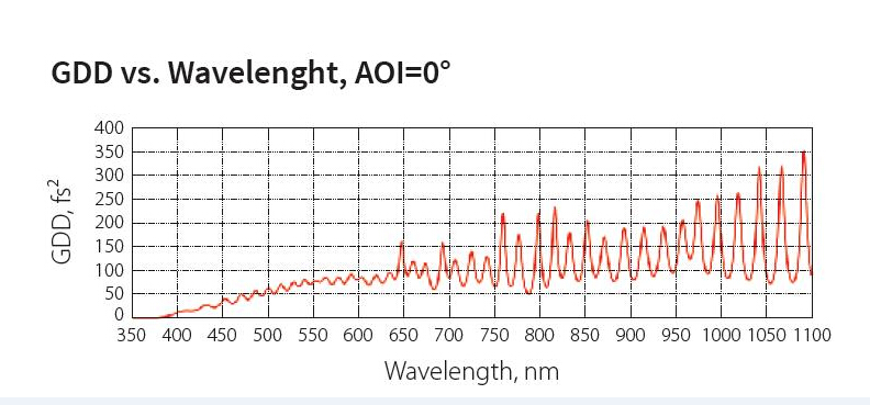 该反射镜可用于宽波长范围(350-1100)的高反光束传输,同时可接受宽范围的入射角度,GDD数值最大不超过350fs^2,对于1ps或者更低的脉宽脉冲影响小。