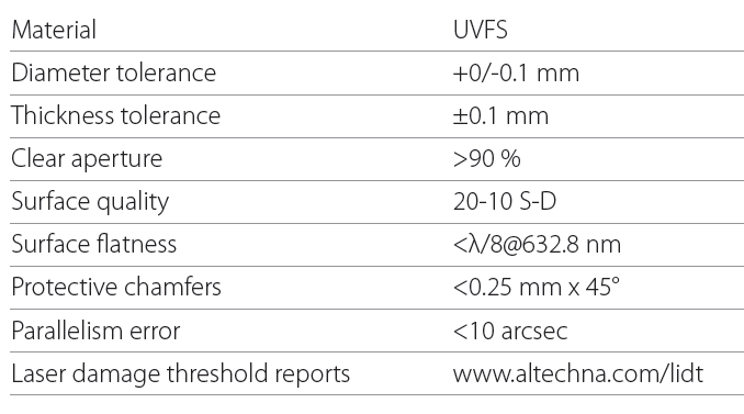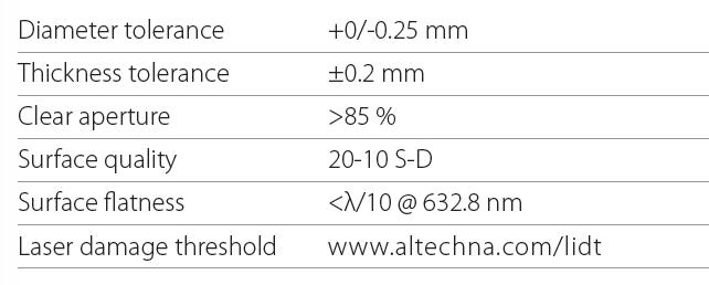 产品名称:Altechna反射镜产品简介:1.HR宽带反光镜(HRBroadBandMirrors)增反宽带镜片可用于宽带光束传输,如多波长光束或者白光等应用,可覆盖0.19um-20um波长范围。标准技术参数:型号:2.超宽带介质反射镜(Ultra-BroadbandDielectricMirrors)该反射镜可用于宽波长范围(350-1100)的高反光束传输,同时可接受宽范围的入射角度,GDD
