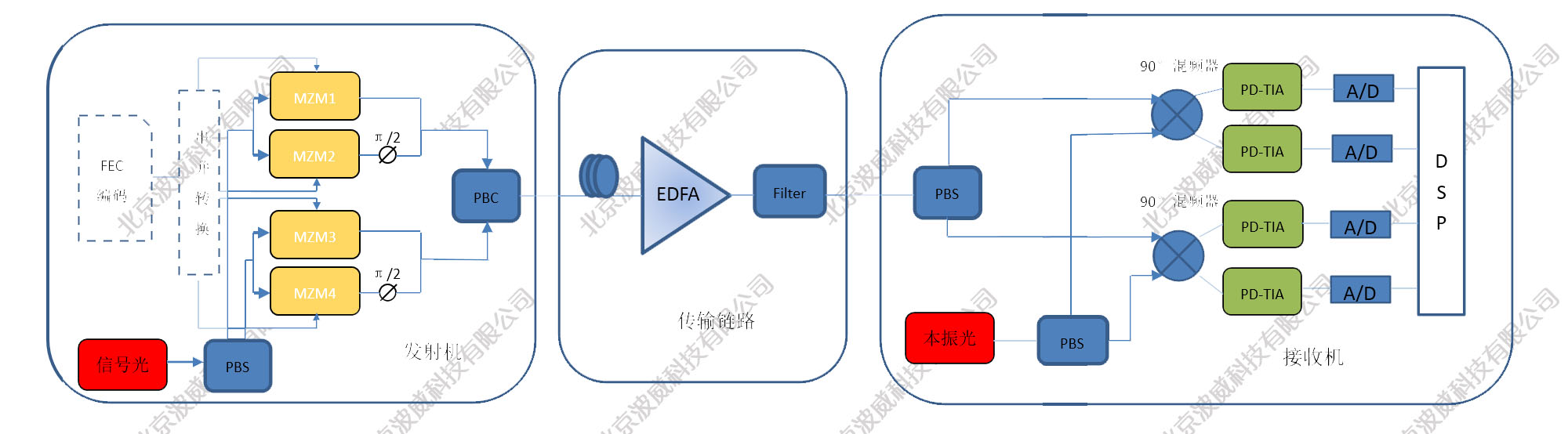 在100G相干光模块的设计中,凭借相对于其他方式的高OSNR和灵敏度等优点,DP-(D)QPSK逐渐成为业界的主流。面对特征各异的传输码型,在综合考虑其传输系统各项参数的基础上,传输距离、通道间隔、兼容性、模块化和成本等成为了码型选择的主要考虑因素。下图为简单的相干通信结构图。
