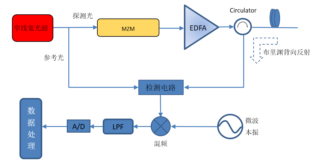 分布型光纤传感技术是目前国内外研究的热点,具备提取大范围测量场的分布信息的能力,能够解决目前测量领域的众多难题,因此,具有巨大的应用潜力。基于布里渊散射的分布型传感技术的研究起步较晚,但由于它在温度测量上具有较高的测量精度、测量范围以及空间分辨率,因此这种技术具有非常大的研究价值。分布式光纤布里渊传感有两种实现方案:直接检测式和外差检测式。而外差能检测式具有良好的空间滤波和光谱滤波能力、信噪比、等优点受到人们越来越多的关注。而外差检测式光纤温度传感器将会使得人们的生活更加便利。